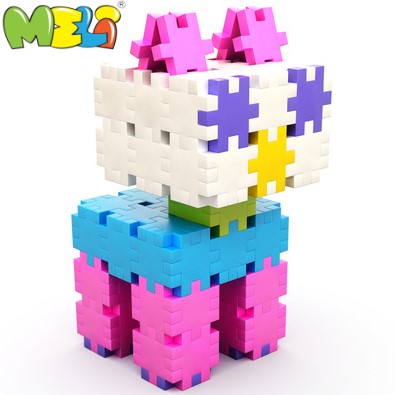 Elastyczne i przyjemne w dotyku klocki o wymiarach elementów 2,5x2,5 cm, przypominające puzzle, przeniosą malucha w świat wyobraźni.