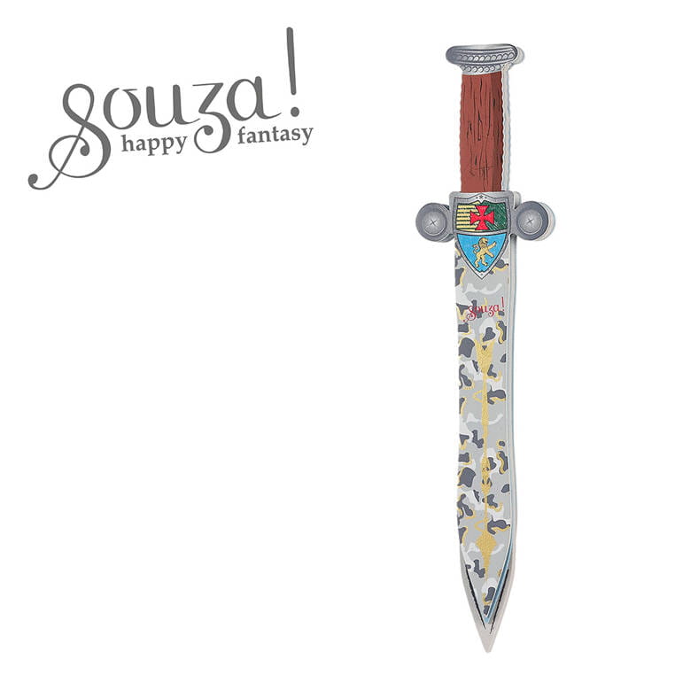 Miecz rycerski Ronald holenderskiej marki Souza! jest wykonany z lekkiej i trwałej pianki EVA, jego kolorystyka imituje metalowe ostrze z przebarwieniami na wzór starych blach i drewnianą rękojeść.