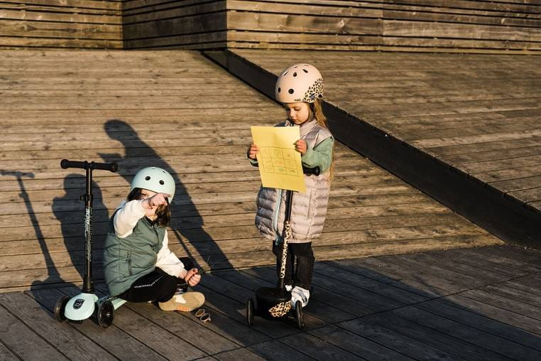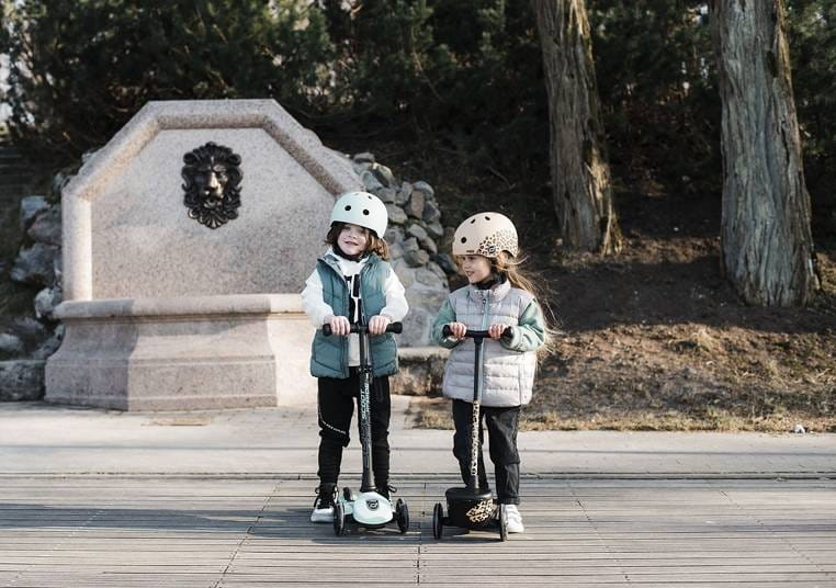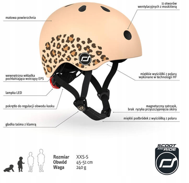 SCOOTANDRIDE Kask XXS-S dla dzieci 1-5 lat Leopard. Ultralekki (waży zaledwie 240 g!), innowacyjny i stylowy dziecięcy kask ochronny austriackiej marki SCOOT&RIDE, który „rośnie” razem z maluchem. Dla dzieci już od 1. roku życia, na obwód głowy od 45 do 51 cm, regulowany za pomocą pokrętła z tyłu.