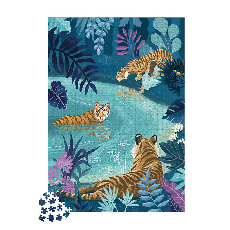 Puzzle artystyczne Spotkanie tygrysów francuskiej marki JANOD składają się z 1000 elementów, które po ułożeniu tworzą piękną malarską grafikę: zakole rzeki w deszczowym lesie w wielu stonowanych odcieniach niebieskiego, nad którą spotkały się trzy tygrysy i przysiadła długowłosa dziewczyna w jasnej sukience i wianku na głowie.